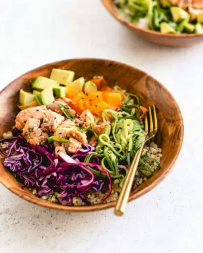 Outra ideia de refeição em tigela: experimente este Salmon Poke Bowl! Poke bowls clássicos tradicionalmente apresentam atum ahi cru, mas você pode usar salmão cozido como um toque divertido. Encha sua tigela com macarrão crocante de pepino e fitas de cenoura com gergelim, repolho em conserva rápida, arroz e um molho saboroso.