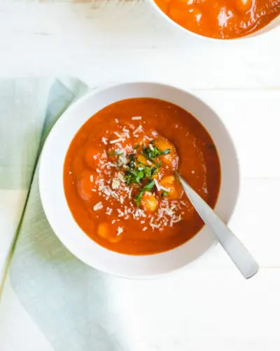 Comida tem tudo a ver com vibração, e esta sopa canaliza todos esses sentimentos aconchegantes e calorosos! Esta receita de sopa de nhoque de tomate é picante e brilhante, recheada com almofadas de nhoque em borracha e coberta com queijo parmesão. O segredo da base cremosa de tomate e manjericão é depois de refogar a cebola e o alho, deglaçar a frigideira com vinagre de vinho branco. O vinagre picante realça o brilho do tomate: e combinado com manjericão fresco apimentado, é irresistível.