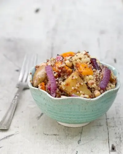 Aqui está uma receita de quinoa vegana que é aconchegante e farta: quinoa com legumes assados! Você tem abóbora e batata para alevinos, assada com cebola roxa, alho e ervas frescas. Então você tem proteínas Quinoa , misturado com azeite e vinagre balsâmico picante. Esses ingredientes bons para você são um acompanhamento fantástico para quem come vegetarianos e veganos.