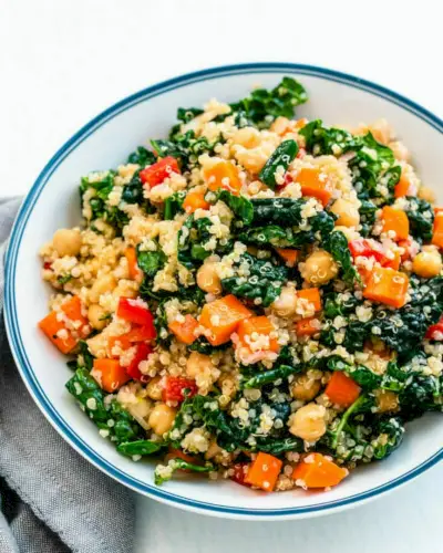 Procurando ideias para um almoço saudável? Aqui está uma receita vegana de quinoa que é lindamente fresca e guarda bem para as refeições durante a semana: salada de couve e quinoa! Está cheio de ingredientes saudáveis: quinoa, couve, pimentão, cenoura: e depois coberto com um molho delicioso e ultra picante! Isso é então saboroso e mantém esse sabor de 3 a 4 dias na geladeira. Também funciona como salada para jantares saudáveis.