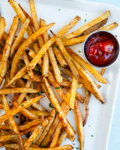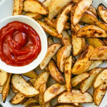 Você nunca vai acreditar que essas batatas fritas estão assadas, não fritas! Assá-los simplesmente em forno quente torna-os crocantes por fora e macios por dentro. São assados com azeite, muita pimenta preta e a mistura perfeita de temperos.