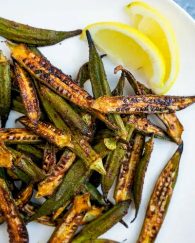 Uma das nossas receitas favoritas de quiabo para acompanhar: experimente assado! Assar quiabo torna-o levemente crocante nas bordas, macio e cheio de sabor picante. Aqui está a melhor parte: não há limo. Alguns métodos de cozinhar quiabo acabam ficando uma bagunça pegajosa, mas esse quiabo fica perfeito. Também é fácil: basta passar 15 minutos num forno bem quente e você terá um acompanhamento fantástico ou um lanche fácil.
