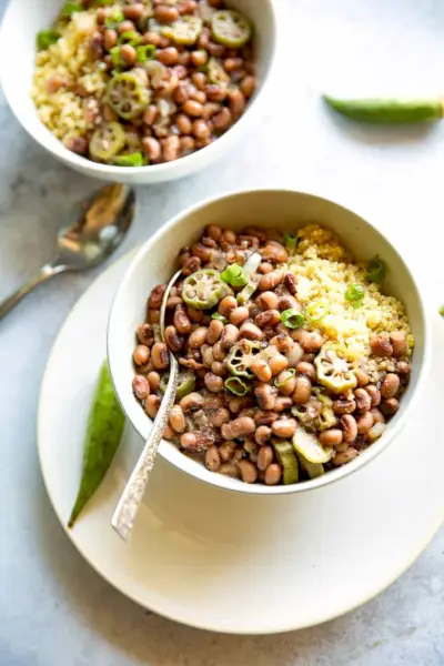 Hoppin 'John é um prato clássico do sul que normalmente é uma combinação de ervilhas, vegetais e carne servida com arroz. Aqui, o feijão-fradinho é mergulhado em um saboroso caldo vegetariano com quiabo e temperos e servido com quinoa nutritiva para um toque saudável. através de Bolos De Vovô