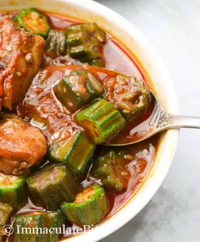 Este ensopado de quiabo é um ensopado grosso à base de tomate com quiabo, frango e temperos. É o melhor alimento para a alma, repleto de nutrientes e também econômico. Esta delícia tradicional da África Ocidental é incrementada com temperos crioulos picantes para uma refeição saudável. através de Mordidas Imaculadas