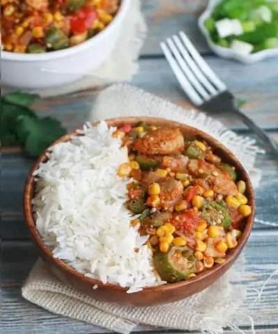 Este molho picante de quiabo e milho é outro favorito do sul dos Estados Unidos, cheio de sabor e repleto de vegetais saudáveis. Este prato farto pode ser servido com sua proteína favorita ou com chips de tortilla. através de Lindas comidas e coisas