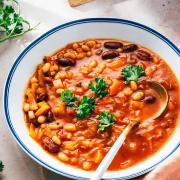 Em primeiro lugar em nossas receitas de sopa fartas, uma tigela aconchegante que é tão farta e satisfatória que você nunca mais vai querer largar a colher. Experimente este clássico Sopa De Feijão Defumado! O feijão-roxo e o feijão-marinho flutuam em um caldo saboroso e esfumaçado de tomates assados no fogo, que tem a textura brilhante certa. Usa feijão enlatado, mas parece que esteve fervendo o dia todo. Cada colherada sedosa e esfumaçada é um pedaço do paraíso