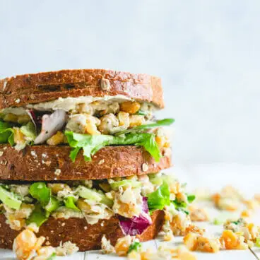 A primeira das nossas melhores receitas para estudantes universitários: este sanduíche de salada de grão de bico! Um almoço ou jantar rápido favorito, é uma brincadeira com salada de frango com grão de bico. Ele vem junto em um piscar de olhos e tem um sabor cremoso e incrível. Você vai sentir vontade disso! Em vez de um sanduíche, você também pode comê-lo com biscoitos ou embrulhado.