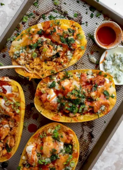Terminamos com a nossa receita favorita de espaguete com abóbora: abóbora recheada com frango de búfala! Frango macio, molho de búfala, cheddar picante e queijo azul, tudo em um espaguete de abóbora? Sim, por favor! através de Como doce come