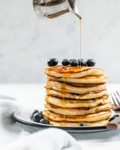 Que criança não adora panquecas de mirtilo? Essas panquecas veganas são fofas, um pouco picantes por causa das frutas vermelhas e doces o suficiente. Umedecidos com xarope de bordo, eles são muito aconchegantes e tudo o que uma panqueca deveria ser.