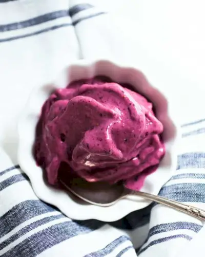 Aqui está uma maneira divertida de fazer uma guloseima saudável para as crianças: um belo creme! O que é um creme legal? É um 'sorvete' feito com banana congelada como base. Não há laticínios! Este sorvete traz mirtilos misturados com bananas congeladas, usando leite de coco para torná-lo cremoso. É uma das guloseimas favoritas do nosso filho Larson: ele não precisa saber que não é realmente 'sorvete'. Embora seja um dos favoritos em nossas receitas veganas para crianças... também é um grande favorito entre os adultos. (Isso está começando a ser um tema...)