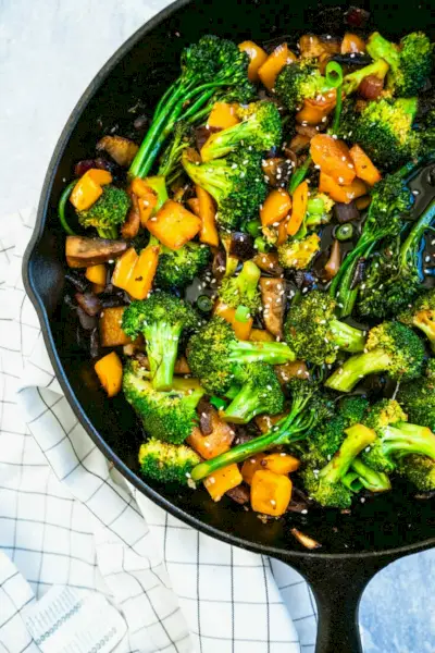 Por último, mas não menos importante, em nossas receitas de frigideira de ferro fundido... um refogado de legumes! O ferro fundido é perfeito para cozinhar em fogo alto, como salteados. Esses vegetais são coloridos e têm um sabor tão delicioso que você não vai querer parar de comê-los! É uma ótima maneira de comer todos os melhores vegetais saudáveis! Fazer um refogado é fácil, mas você também precisa conhecer alguns truques para acertar. Aqui está tudo o que você precisa saber para fazer uma saborosa frigideira com vegetais salteados.