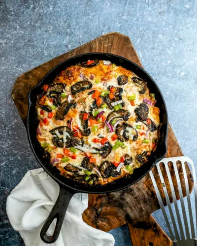 Primeiro em nossas receitas de frigideira de ferro fundido: pizza de ferro fundido! Esta pizza caseira épica tem o mesmo sabor da pizza de massa grossa da sua pizzaria favorita. O cheiro que sai do forno é suficiente para fazer você babar visivelmente (nós!). Cozinhar em uma frigideira de ferro fundido deixa a crosta crocante por fora e macia por dentro: e o queijo vai até as bordas. Essas coberturas de estilo supremo com queijo pegajoso e molho de tomate com alho… bem, é a verdadeira perfeição.