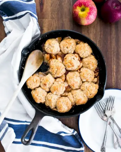 Aqui está uma ideia divertida de sobremesa que você pode preparar direto na sua frigideira de ferro fundido... porque uma frigideira não serve apenas para comida saborosa! As aconchegantes maçãs temperadas são cobertas com biscoitos macios, todos aninhados em uma frigideira e assados até dourar. Sirva com um pouco de sorvete derretido e é totalmente irresistível.