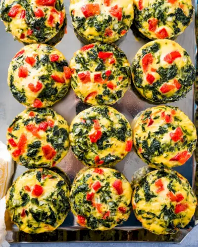 Aqui está um café da manhã divertido e fácil de preparar: Muffins de ovo! Asse ovos mexidos em forminhas de muffin com vegetais saudáveis e leve-os à geladeira para as refeições durante toda a semana! Isso funciona como um café da manhã para viagem e é perfeito para lancheiras infantis. Também acabamos tirando-os da geladeira para um lanche rápido. O recheio vem recheado de coisas boas: muito espinafre, queijo cottage para proteínas saudáveis e pimenta vermelha em pote.