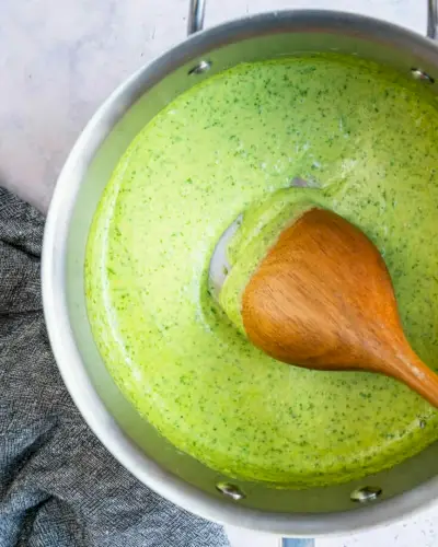 Aqui está um movimento genial de cozinha: molho pesto de 5 minutos! Você sabia que pode ferver pesto e creme e engrossar até formar um molho? Basta jogar esses dois ingredientes em uma panela e pronto! Você tem um molho verde lindo e brilhante que é perfeito para salmão. Experimente com Salmão Grelhado Fácil ou Salmão Assado no Forno .