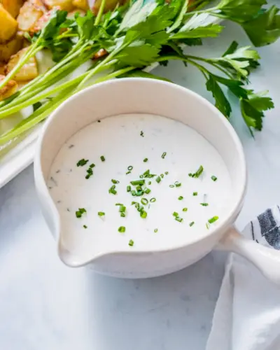 Por último: este molho de creme de leite fácil? Este leva apenas 5 minutos para montar: e tem um gosto incrível ! Este molho refrescante usa alho, cebola e cebolinha para fazer um molho rápido e repleto de sabor saboroso. É ótimo com Salmão Grelhado ou Salmão Grelhado .
