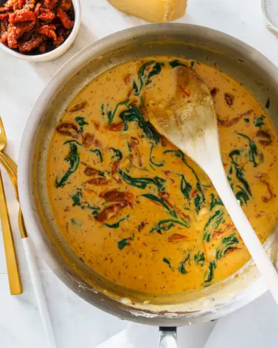 Procurando um molho que deixe qualquer coisa com um sabor irresistível? Experimente este molho cremoso de tomate seco ao sol! Está repleto de sabor rico e cremoso com alho, espinafre e rajadas terrosas e brilhantes de tomate. Sele o salmão na frigideira e retire-o da frigideira, faça este molho e coloque o salmão na frigideira por 1 minuto para aquecer. É de morrer!
