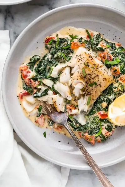 Por último: uma forma de deixar o bacalhau com um sabor cremoso e sonhador: Peixe Florentino! Esta versão saudável da versão com frango pode ter um sabor ainda melhor. Sirva o bacalhau grelhado sobre uma camada cremosa de espinafre: fica com sabor de restaurante em apenas 20 minutos. através de Sabor Magro