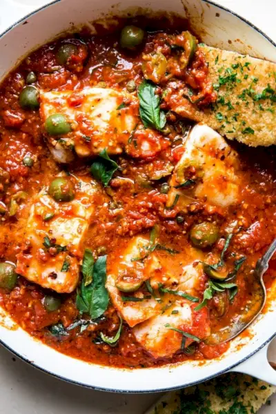 O molho Puttanesca não serve apenas para massas! Esta receita salgada, saborosa e fácil de puttanesca de peixe branco é tão linda e deliciosa que você nunca imaginaria que leva apenas cerca de 30 minutos para fazer. Combina com qualquer peixe branco, mas o bacalhau é um dos melhores. através de O Moderno Próprio