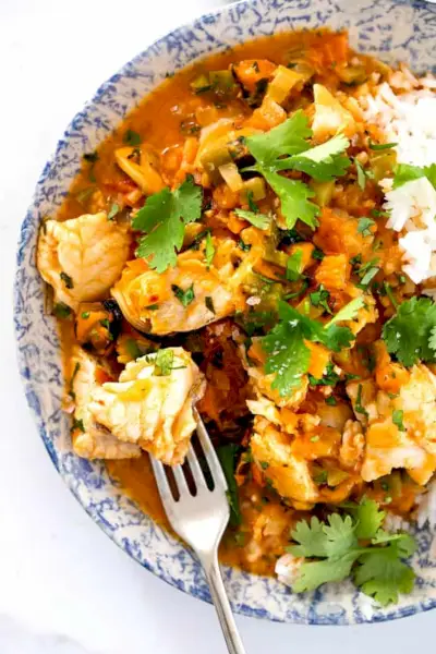 Esta Moqueca é saborosa e reconfortante com bacalhau, coco cremoso, tomate, limão e tempero peri peri apimentado. O ensopado, chamado Moqueca Baiana, é originário do estado da Bahia, no Brasil, o coração da população afrodescendente no Brasil. Receita por Viagens globais de cozinha através de Bolos De Vovô