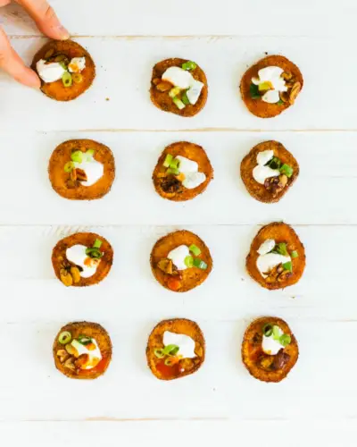 Uma receita de aperitivo saudável favorita dos fãs: rodelas de batata doce! Esta é quase como uma bruscheta que troca batata-doce assada por pão. Você cobrirá essas rodelas de batata assada com tudo que uma batata assada carregada adoraria: creme de leite, queijo, cebolinha e um bocado de molho picante. O sabor carregado em uma mordida é irreal! Fazemos isso com frequência e os convidados os devoram rapidamente.