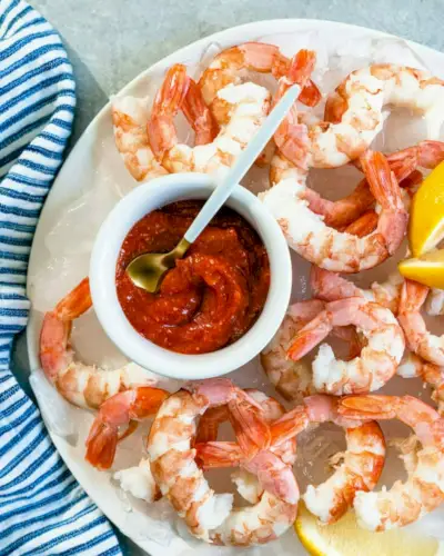Aqui está uma receita de aperitivo à moda antiga que nunca sai de moda: coquetel de camarão! Pode não ser o primeiro na sua lista de aperitivos saudáveis, mas você sabia que o camarão é um alimento com calorias relativamente baixas? 1 camarão médio tem apenas 7 calorias e 1 camarão gigante tem 14 calorias. Sem falar que os camarões são repletos de nutrientes e proteínas magras! Combine isso com molho de coquetel à base de tomate, também de calorias relativamente baixas, e você terá um aperitivo muito bom para você.