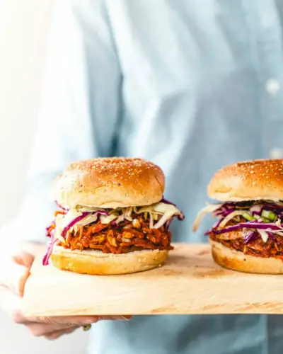 A jaca é uma fruta tropical utilizada como substituto da carne de porco desfiada. O que?! Sabemos que parece loucura, mas é absolutamente delicioso. Este sanduíche de churrasco de jaca tem molho barbecue perfeitamente equilibrado com doce, picante, salgado e um pouco alcoólico. É um molho cozido com bastante ketchup, cebola, alho, vinagre de cidra e um pouco de uísque. Em seguida, coloque-o em um pão com nosso salada de repolho com vinagre fácil ou nosso melhor salada de repolho cremosa . É uma das refeições sem carne mais satisfatórias que existem.