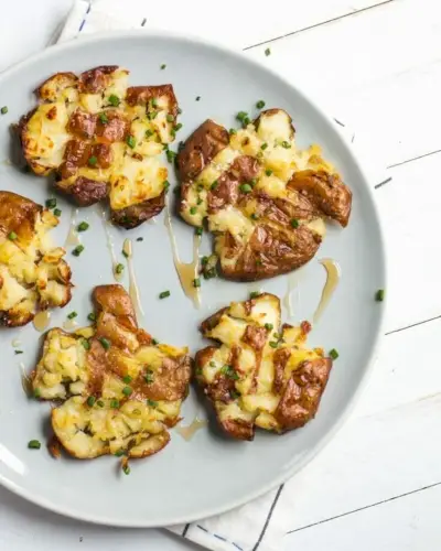 Batatas esmagadas requerem um pouco de tempo de preparação, mas valem a pena pelo sabor incrível! Ferva, amasse e leve ao forno até ficarem crocantes. A crocância das bordas crocantes é magicamente! Aqui nós os combinamos com uma garoa balsâmica para realçar os sabores.