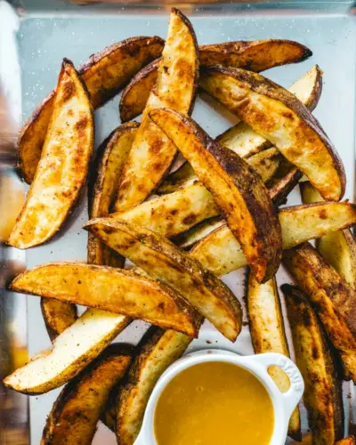 Desejando batatas fritas? Experimente estes clássicos Steak Fries: fatias grossas perfeitas que ficam crocantes por fora e fofas por dentro. O tradicional filé frito que você encontra em um restaurante é frito, mas é fácil de fazer em casa, assado no forno. São ainda mais deliciosos, na nossa opinião! Prepare um molho rápido e saboreie-o como acompanhamento fácil ou como aperitivo saboroso.