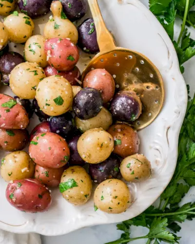 Aqui está um lindo acompanhamento de batata, simples e cheio de sabor: Batatas Cozidas no Vapor com Manteiga de Alho! Esta receita é ideal com batatas novas ou batatinhas, aquelas lindas batatinhas com uma textura rica e amanteigada. Melhor ainda, use um medley de batata para uma variação na cor dourada, vermelha brilhante e roxa forte. Misture-os com manteiga, alho e salsa e você terá um acompanhamento rápido que deixará todo mundo louco.