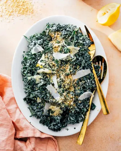 Não há nada melhor que um clássico Salada César …a menos que seja uma Salada César de Couve! Usar folhas de couve em uma salada César tornou-se popular em restaurantes: e por um bom motivo. A textura fofa e estriada das folhas é ideal para revestir o molho César. Esta versão do Kale Caesar é a nossa escolha, com um molho caseiro fresco e cremoso e pão ralado crocante em cada mordida.