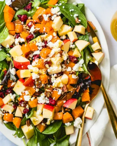 Aqui está uma salada notável de outono ou inverno estrelada pelo ingrediente favorito de todos: Salada de Abóbora Butternut! Esta é uma sinfonia em uma tigela: abóbora doce farta combina com maçã crocante, cranberries em borracha e um toque cítrico vinagrete de laranja . Todos os melhores sabores dos ingredientes do outono e do inverno cantam juntos em perfeita harmonia!