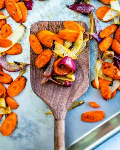 A única coisa melhor do que cenouras assadas ? Cenouras assadas e cebola! Sim, simplesmente adicionar uma cebola à bandeja de cenouras assadas torna-as ainda mais divertidas de comer. Adicione parte de uma cebola vermelha e amarela e você obterá uma bela variação de cor e textura. A cebola fica macia com as pontas carbonizadas, com um sabor incrivelmente adocicado. É o acento perfeito para moedas de cenoura temperadas com alho e tomilho.
