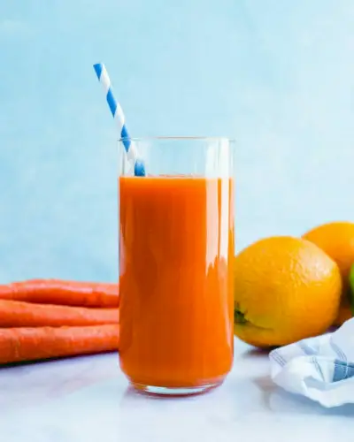 Aqui está um dos melhores sucos que você pode adicionar diariamente: suco de cenoura! Está cheio de nutrientes e tem um gosto fantástico. Em vez de beber refrigerante, por que não saborear esta beleza laranja brilhante? Esta receita de suco de cenoura resulta em um suco com um lindo sabor fresco. Tem doçura natural de laranjas e maçãs e um pouco de sabor picante de limão. Melhor ainda, você nem precisa de um espremedor para fazer isso! Embora você possa usar um, se tiver.