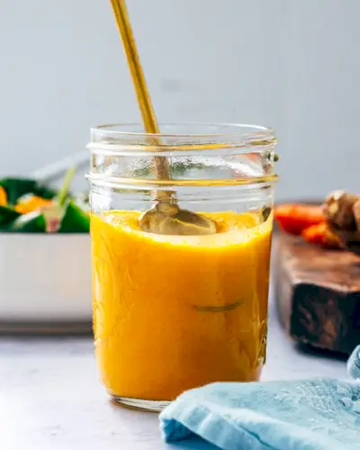 Aqui está uma garoa fresca e picante para saladas e refeições em tigela: Molho de Cenoura e Gengibre! Este molho vibrante é repleto de sabores salgados, salgados, picantes, brilhantes e doces ao mesmo tempo. Incorpora sabores de inspiração asiática, como missô e vinagre de arroz, mas tem um toque diferente: o tahine mediterrâneo traz um corpo cremoso ao molho.