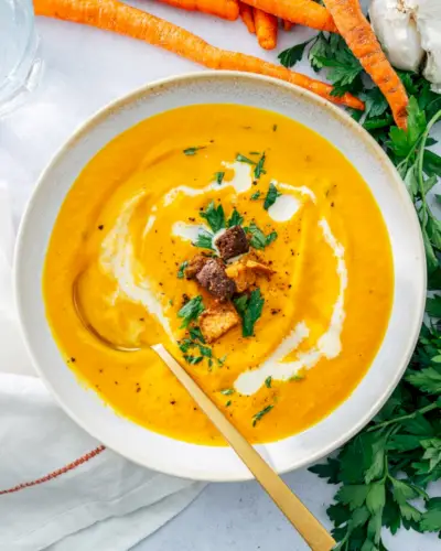 Aqui está uma receita aconchegante de cenoura que é como uma tigela cheia de sol em um dia cinzento: esta simples sopa de cenoura! Um sabor forte e brilhante emana deste purê de laranja e é deliciosamente cremoso com um toque de creme. É rápido e simples de montar, com uma pequena lista de ingredientes: ótimo como primeiro prato para um jantar aconchegante ou uma saborosa sopa de almoço com queijo grelhado.