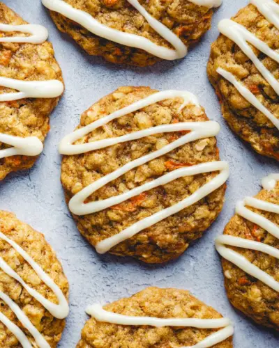 Esses biscoitos macios e mastigáveis têm todos os melhores elementos do bolo de cenoura - o bolo úmido e apimentado, pedaços vibrantes de cenoura e nozes ou nozes crocantes - condensados na perfeição do tamanho de uma mordida! Cubra tudo com um fiozinho de cobertura de cream cheese e é um doce perfeito
