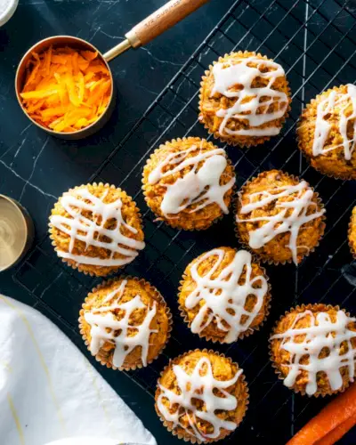 Aqui está uma receita de cenoura que você precisa em seu arsenal: muffins de bolo de cenoura! São lindamente úmidos e condimentados, com temperos aconchegantes intercalados com nozes e fios brilhantes de cenoura. Adicione uma cobertura picante de cream cheese para decorar os topos e isso os levará ao território de uma estrela do rock.