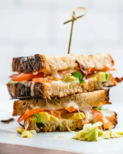 E por último, nos nossos jantares fáceis durante a semana: quem não gosta de um bom sanduíche de queijo grelhado? Aqui está um com um toque glamoroso: o queijo grelhado com abacate. A simples adição de abacate e tomate a um queijo grelhado padrão torna-o adequado para servir em companhia! Embora seja um prato simples, o queijo grelhado pode ser enfeitado tanto quanto você quiser.