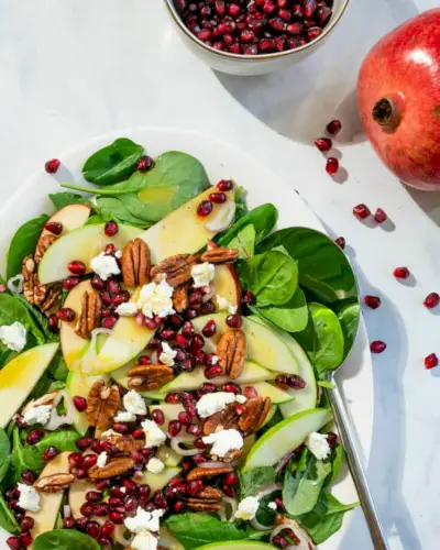 Aqui está uma salada de outono fantástica: salada de romã! Crocante sementes de romã faça um lindo confete por cima de folhas verdes. Adicione fatias de maçã verde azeda, nozes torradas e queijo de cabra ou farelos de queijo feta e é uma verdadeira sinfonia de sabores! Escolha entre algumas opções de curativos diferentes: nossos favoritos são molho de vinagre de maçã ou vinagrete de romã .
