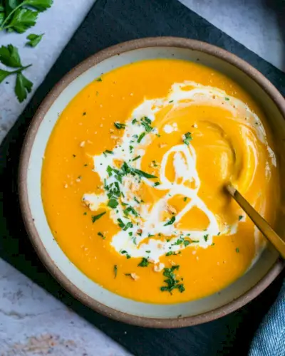 A receita de sopa de outono por excelência? Sopa de abóbora! Aqui, os sabores de coco, gengibre e pasta de curry tailandês combinam perfeitamente com esta abóbora de laranja levemente adocicada. É sedoso, cremoso e quente de dentro para fora.