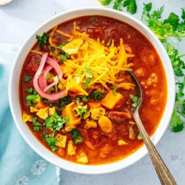 Aqui está uma receita de sopa de outono favorita: Pimentão De Abóbora! Adicionar purê de abóbora ao pimentão adiciona um corpo intensamente cremoso e saboroso a este prato clássico. (Não temos certeza de como passamos tanto tempo sem ele!) Este é farto e saudável, cheio de temperos, batata-doce e feijão.