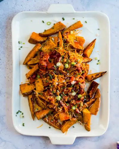 Faça uma frigideira com nossas irresistíveis rodelas de batata-doce, levemente crocantes e temperadas na perfeição. Em seguida, prato principal adicionando coberturas (duplo yum!). Adicione o feijão preto com pimenta acima ou este Pimentão Rápido e adicione o queijo e o molho. As crianças adoram!