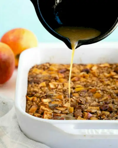 *Faça instruções antecipadas: não faça a panela inteira com antecedência e leve à geladeira durante a noite, pois a aveia absorverá todo o líquido. Você pode misturar os molhados e os secos separadamente e armazenar em recipientes separados (com os molhados refrigerados), depois despejá-los juntos pela manhã e assar.