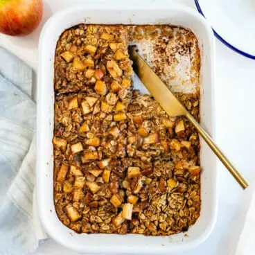 Esta aveia assada naturalmente sem glúten é aconchegante e reconfortante, salpicada de maçãs e aromatizada com canela e pimenta da Jamaica. É perfeito para reuniões especiais ou leve à geladeira e coma durante toda a semana. Demora cerca de 1 hora do início ao fim, mas o sabor vale a pena e a maior parte desse tempo é sem intervenção. As sobras guardam bem e fazem uma receita de café da manhã saudável que dura a semana toda!