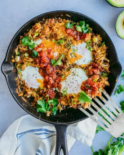Outra ideia saudável para um café da manhã sem glúten: esta caçarola de café da manhã Hashbrown! É farto e satisfatório, combinando batatas fritas com queijo e pimenta em pó, alho em pó e cominho para um sabor saboroso. Porque é fácil de fazer com antecedência, é super simples e de baixa manutenção.