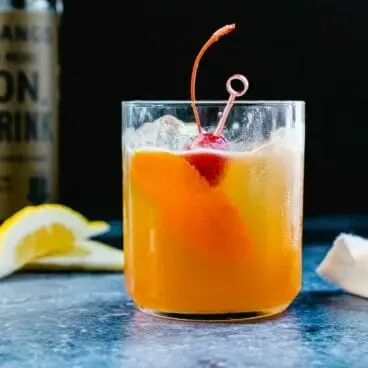 Esta receita fácil de whisky sour é perfeitamente equilibrada e muito fácil de fazer! Decore com uma casca de laranja e uma cereja cocktail.