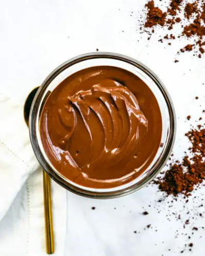 Este lanche de pudim de chocolate pega iogurte grego puro e mistura com chocolate amargo, cacau em pó e xarope de bordo para um lanche satisfatório! São todas as proteínas e probióticos do iogurte, com um toque de chocolate.