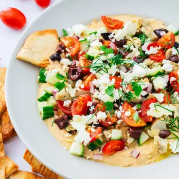 O molho de homus é um lanche rápido e fácil da dieta mediterrânea! Cubra uma travessa com pepino, tomate, azeitonas e queijo feta e mergulhe com lascas de pão sírio integral.
