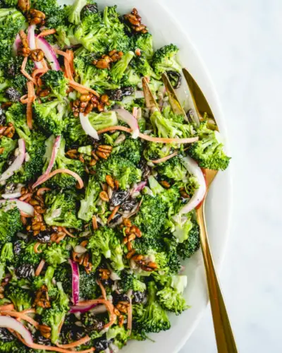 Aqui está um acompanhamento clássico de verão: salada de brócolis! Você sabe, aquela clássica salada americana de brócolis com passas e molho à base de maionese? Esta salada retrô marina as florzinhas até que fiquem macias e saborosas. É estranhamente satisfatório e nos dá todas aquelas vibrações nostálgicas. Aqui está uma versão nova e melhorada para torná-lo fresco e saudável: mas mantém todo o caráter e delícias do original. Na verdade: achamos que é mesmo melhorar .